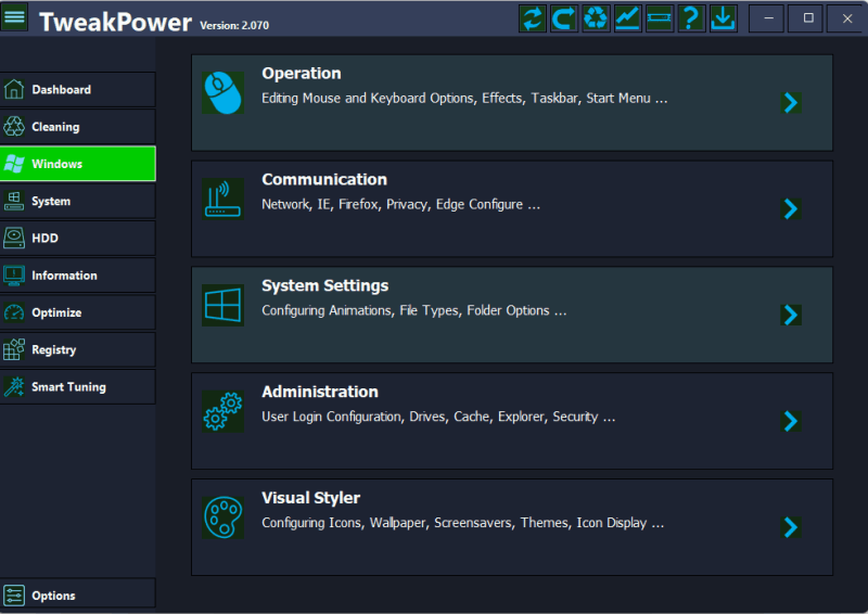 TweakPower offers you numerous tools for optimizing Windows. All of TweakPower's program functions are grouped under an attractive user interface and are easily accessible. The software makes complicated optimization processes easy even for inexperienced users. TweakPower offers direct access to many system settings and hidden options.