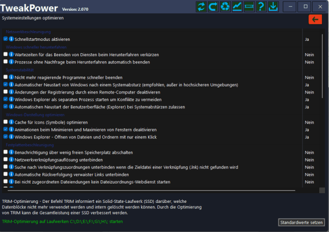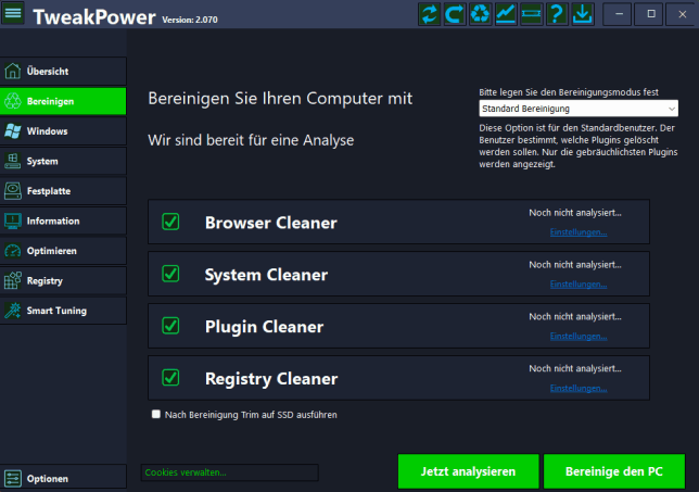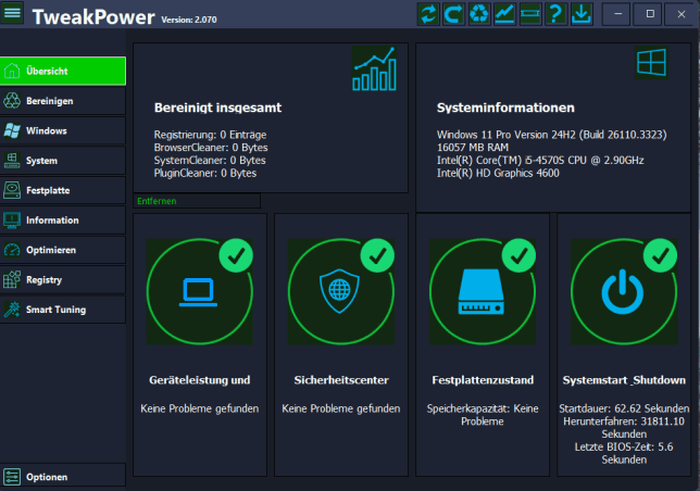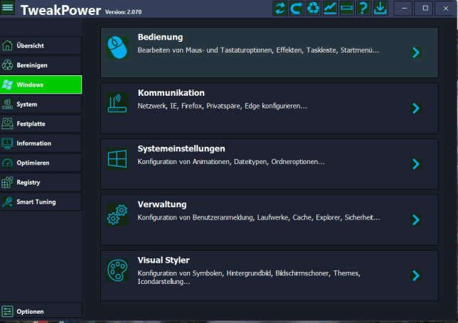 TweakPower bietet Ihnen zahlreiche Werkzeuge zum Optimieren von Windows. Alle Programmfunktionen von TweakPower sind unter einer ansprechenden Benutzeroberfläche zusammengefasst und leicht zugänglich. Die Software macht komplizierte Optimierungsvorgänge auch für unerfahrene Benutzer einfach. TweakPower bietet direkten Zugriff auf viele Systemeinstellungen und versteckte Optionen. Mit der Software tauscht man die System- und Desktop-Icons aus, optimiert die Netzwerkeigenschaften oder den Arbeitsspeicher. TweakPower kümmert sich zudem um Laufwerks- und Sicherheitseinstellungen. Auf Wunsch säubert das Programm die Festplatte, splittet oder verschlüsselt Dateien und löscht per Shredder Daten unwiderruflich.