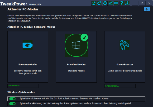 Spielemodus - Mit einem Klick werden über 70 unnötige Prozesse deaktiviert, sodass Sie schneller surfen, Spiele und Videos nutzen können.