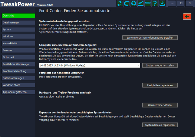 Datensicherungen - TweakPower speichert alle Optimierungen. Alle Änderungen von TweakPower können hier zurückgenommen werden. Wiederherstellungspunkte ermöglichen es Ihnen, die Systemdateien und -einstellungen des Computers in einem früheren Zustand wiederherzustellen und eine vollständige Sicherung oder Wiederherstellung der Registrierung durchzuführen.
